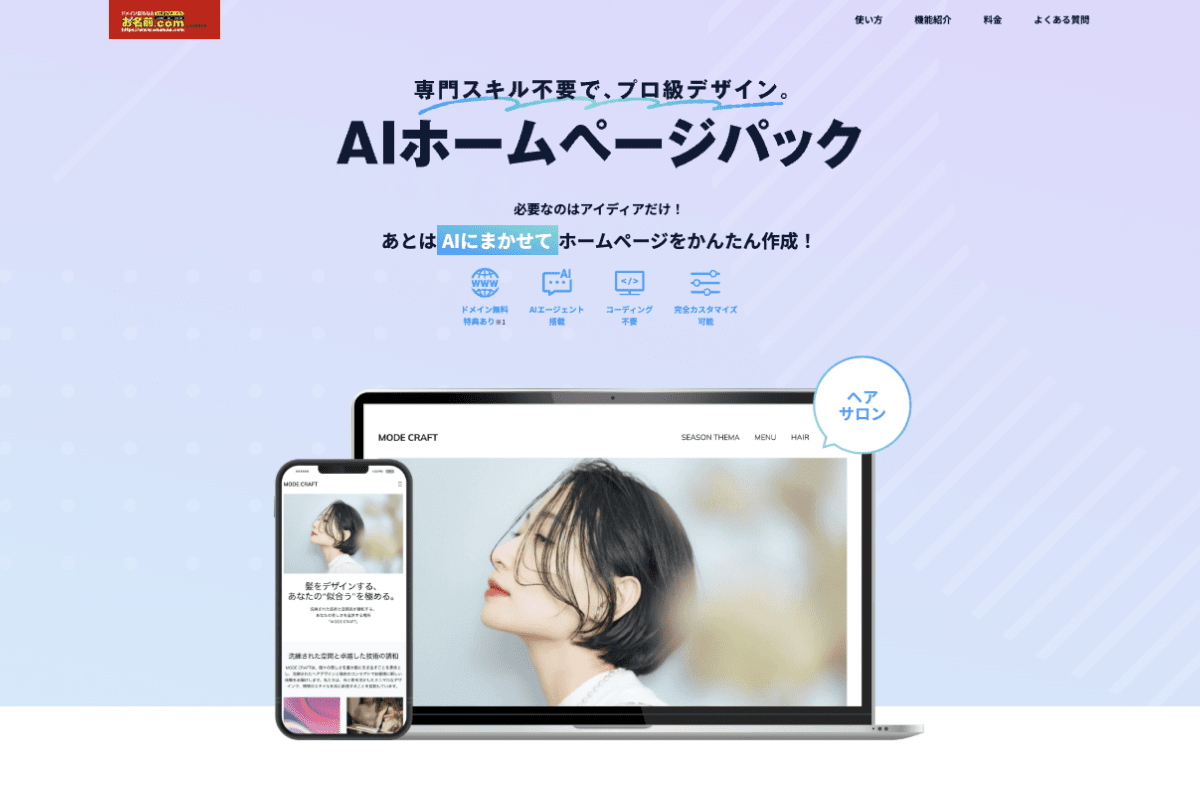 AIがお客様に合った構成とデザインを提案し、約60秒でホームページが出来上がるプランです。