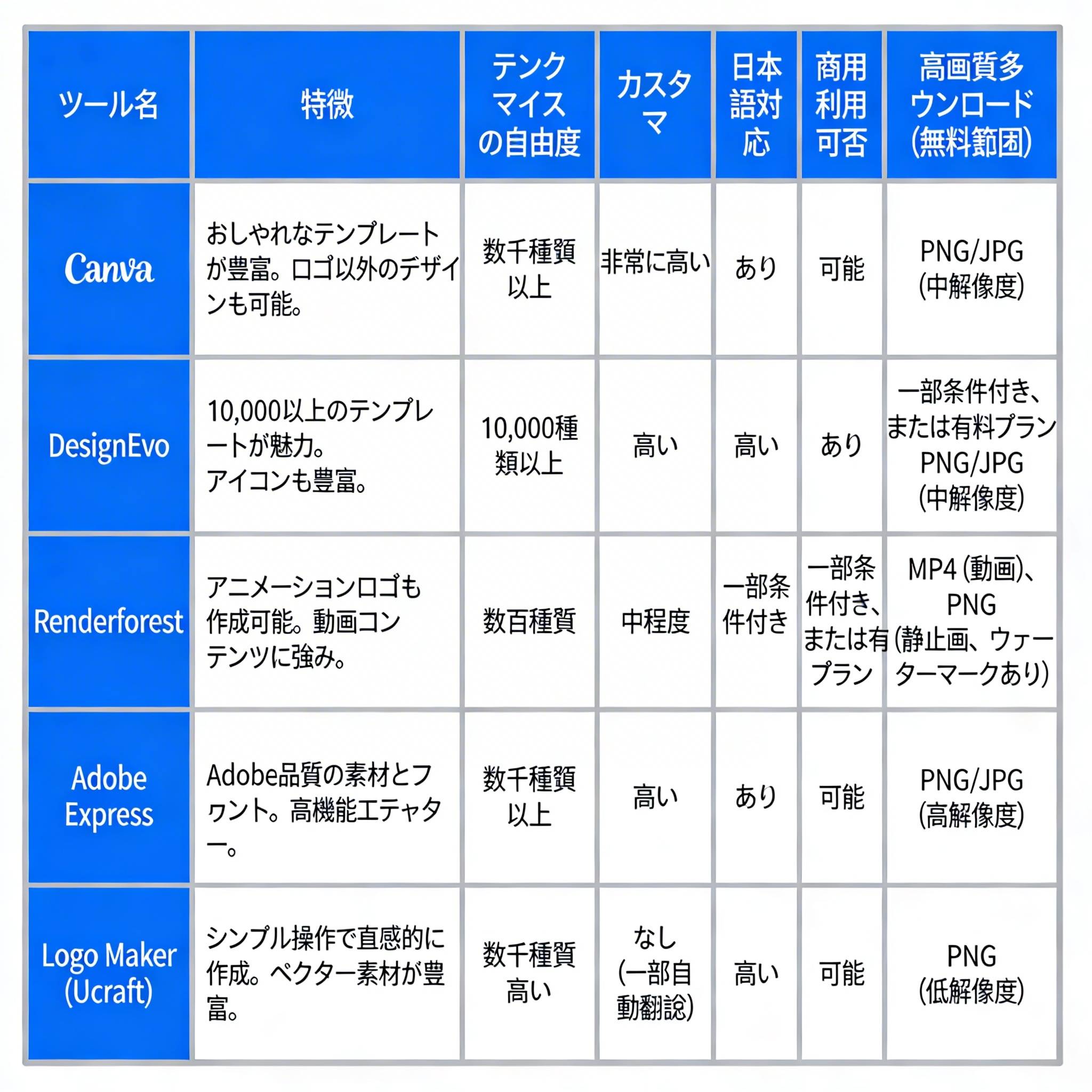 数あるロゴ作成ツールの中から、特に初心者の方におすすめできる無料サービスを厳選してご紹介します。デザイン経験がなくても、高品質なロゴを手軽に作成できるツールばかりです。以下の比較表では、それぞれのツールの「特徴」「テンプレート数」「カスタマイズの自由度」「日本語対応」「商用利用の可否」「高画質ダウンロード(無料範囲)」といった、ロゴ作成ツールを選ぶ上で重要なポイントをまとめています。