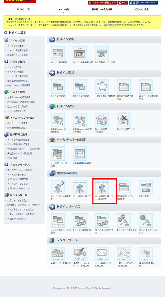 1.『ドメイン設定』メニューから『Whois情報公開代行』をクリックします。