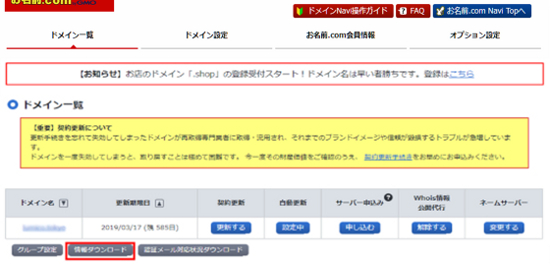 3.「ドメイン一覧」画面が表示されます。「情報ダウンロード」をクリックしてください。