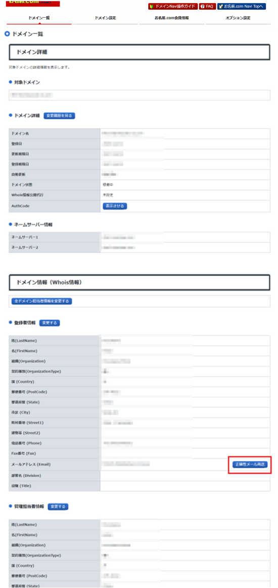 なお、ドメイン登録者情報のメールアドレスが認証対象ではない場合、「正確性メール再送」のボタンは表示されません。